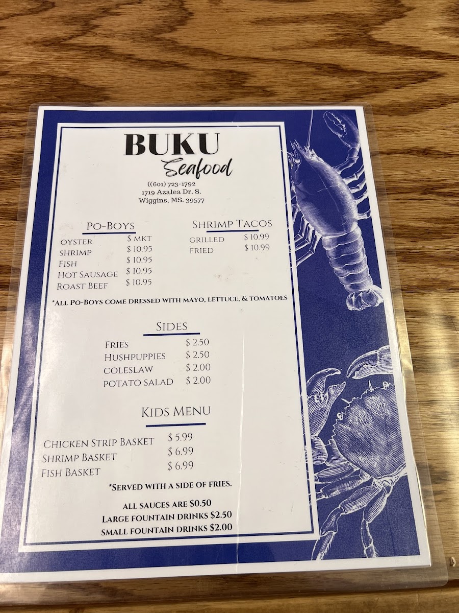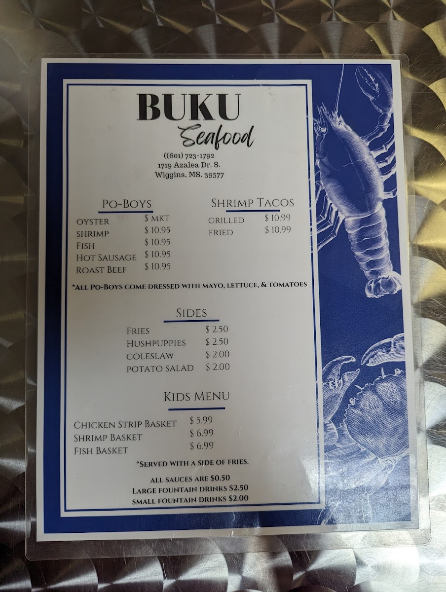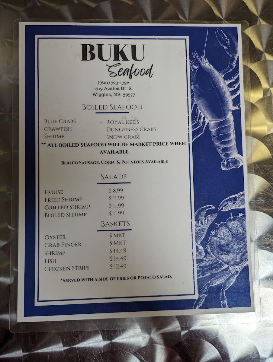 From a reviewer’s perspective, the menu at Buku Seafood delivers a clear and satisfying snapshot of what a casual Southern seafood spot should be: straightforward, generous, and focused on freshness. The heart of the menu lies in its Boiled Seafood selection, where guests can enjoy Blue Crabs, Crawfish, Shrimp, Snow Crabs, and Royal Reds, all prepared in a way that highlights bold seasoning and classic coastal flavors. For lighter options, the salad lineup offers variety with House Salad, Fried Shrimp Salad, Grilled Shrimp Salad, and Boiled Shrimp Salad, making it easy to balance indulgence with something refreshing. Those craving comfort food will appreciate the baskets, including Crab Finger Basket, Shrimp Basket, Fish Basket, and Chicken Strips Basket, each designed for hearty appetites. The Po-Boys section adds another layer of Southern charm with Shrimp Po-Boy, Fish Po-Boy, Hot Sausage Po-Boy, and Roast Beef Po-Boy, ideal for anyone wanting a filling sandwich packed with flavor. Classic sides such as Fries, Hushpuppies, Coleslaw, and Potato Salad round out meals perfectly, while families will find convenience in the Kids Menu featuring Chicken Strip Basket, Shrimp Basket, and Fish Basket. Finally, the Grilled options provide flexibility for diners seeking a different preparation style. Overall, Buku Seafood’s menu feels cohesive and thoughtfully put together, making it a strong conclusion to a dining experience centered on reliable seafood favorites and Southern comfort.